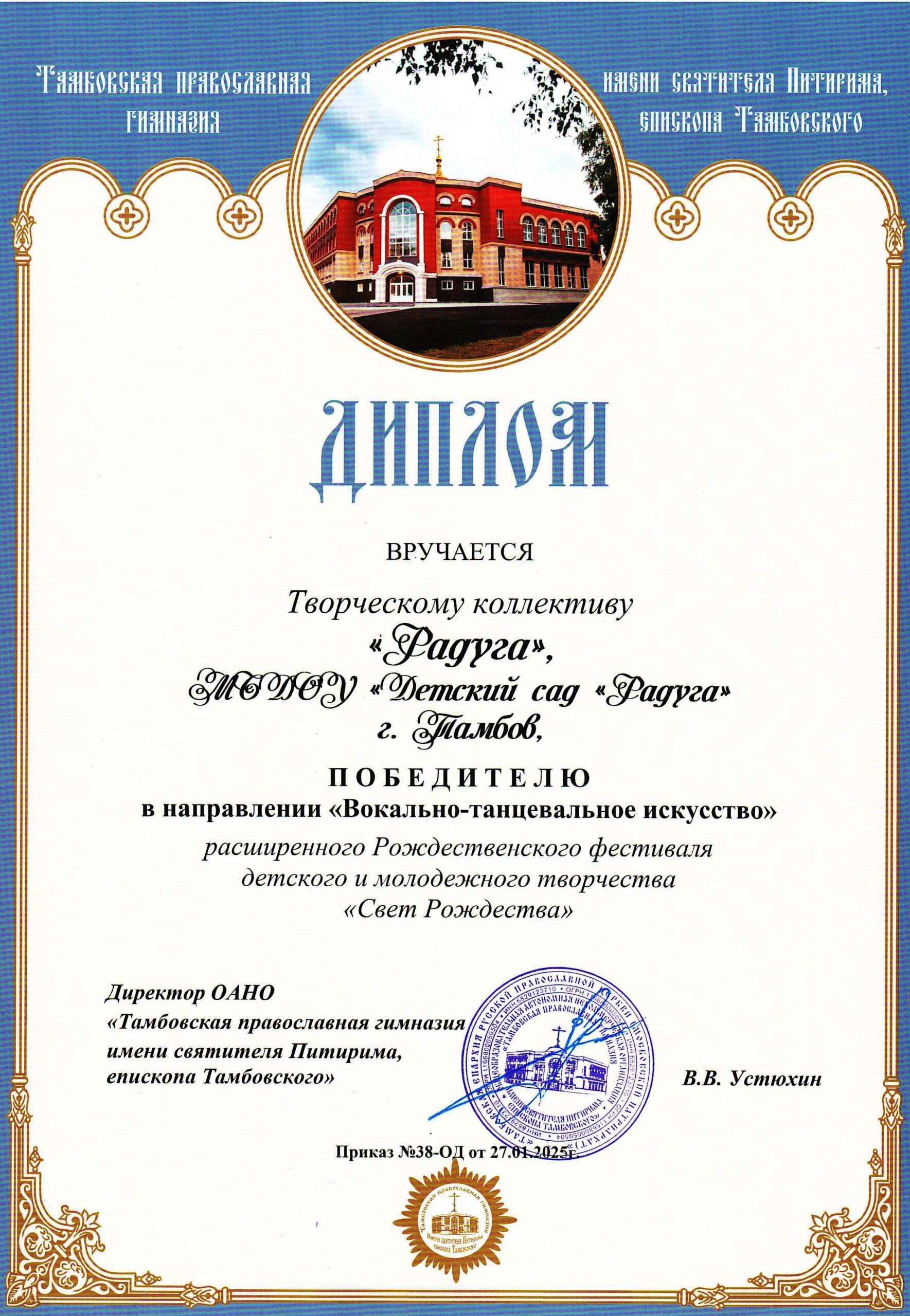 Диплом Победителя в направлении «Вокально-танцевальное искусство» расширенного Рождественского фестиваля детского и молодежного творчества «Свет Рождества» (Приказ ОАНО «Тамбовская православная гимназия имени святителя Питирима, епископа Тамбовского» № 38-ОД от 27.01.2025г.)