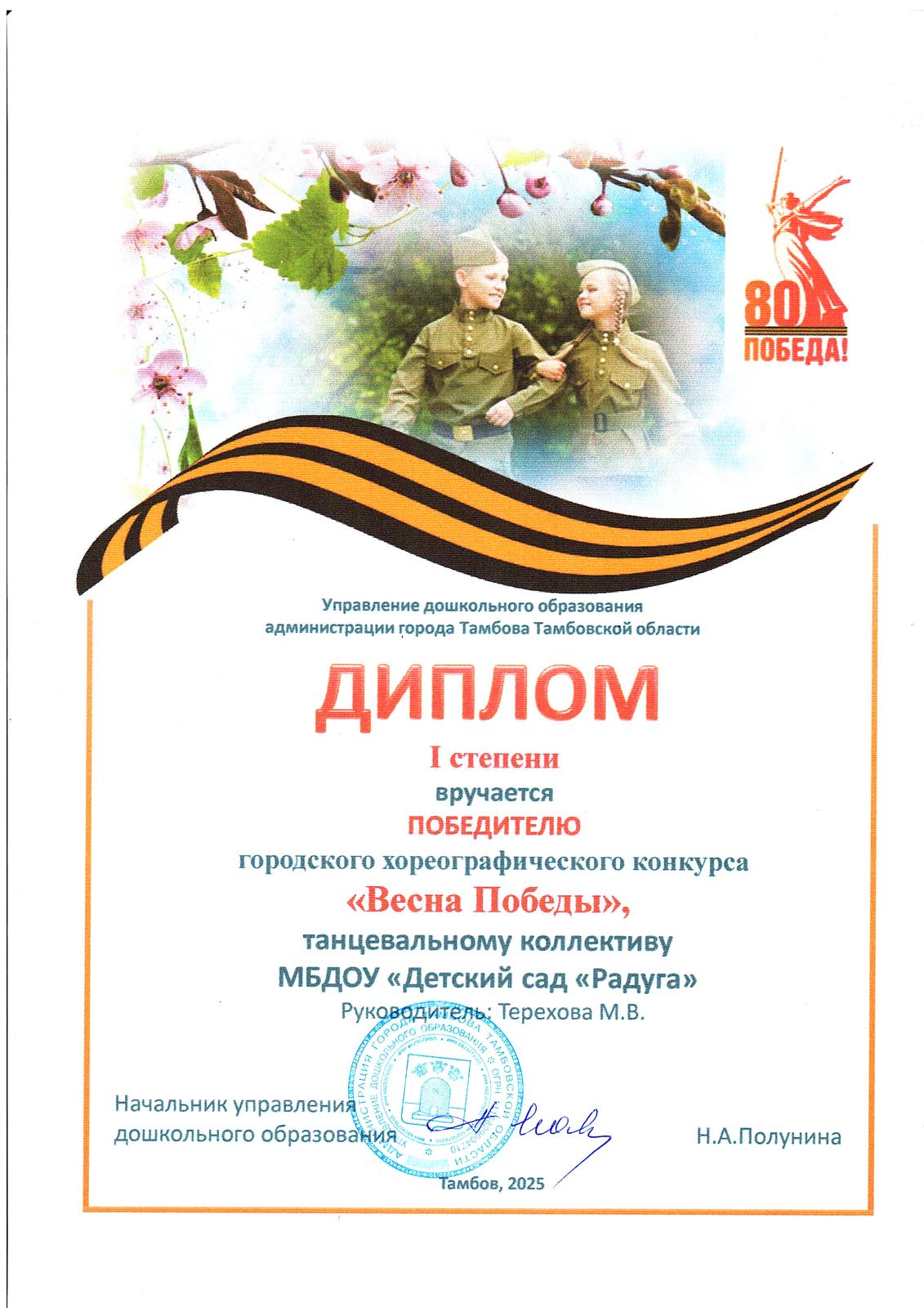 Диплом I степени ПОБЕДИТЕЛЮ городского хореографического конкурса «Весна Победы», танцевальному коллективу МБДОУ «Детский сад «Радуга» (Тамбов, 2025)