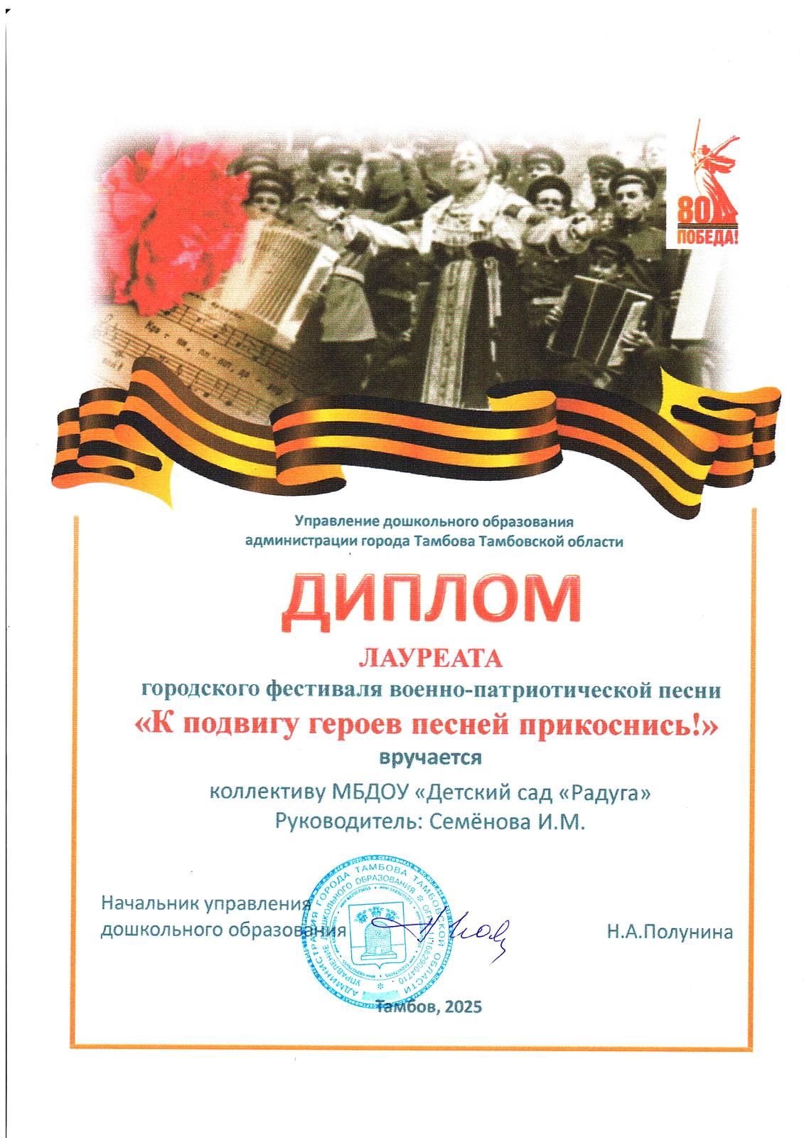 Диплом ЛАУРЕТА городского фестиваля военно-патриотической песни «К подвигу героев песней прикоснись!» коллективу МБДОУ «Детский сад «Радуга» (Тамбов, 2025)