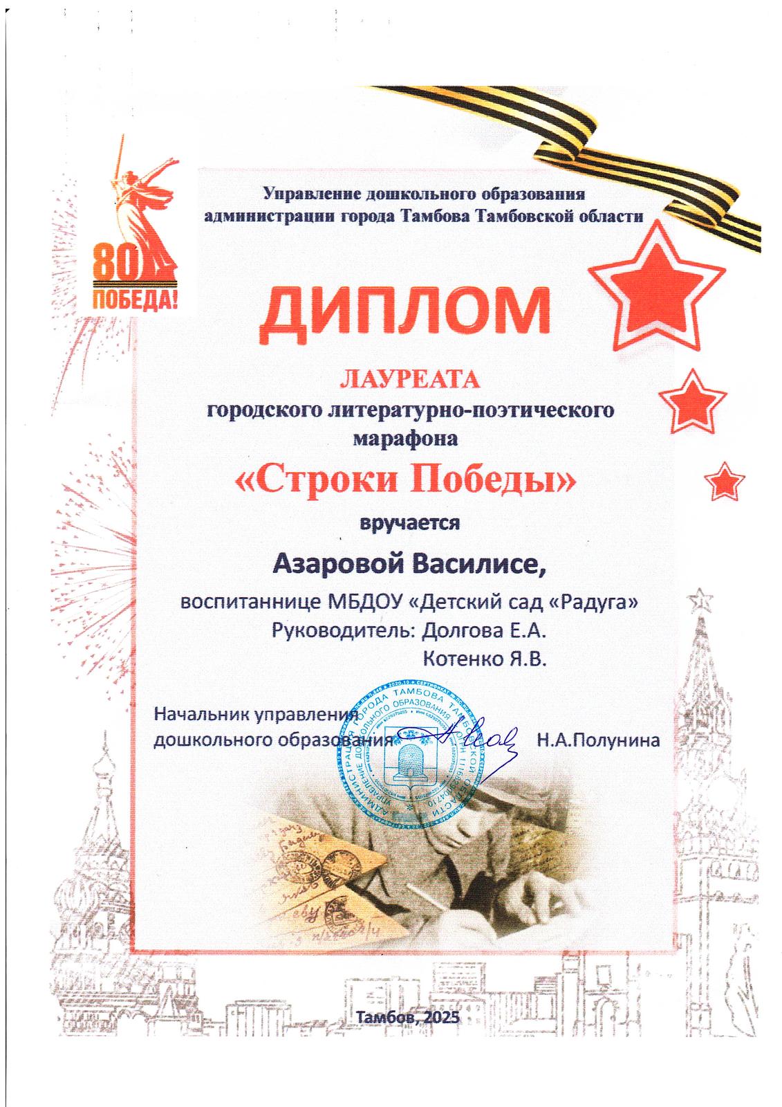 Диплом ЛАУРЕАТА городского литературно-поэтического марафона «Строки Победы» (Тамбов, 2025)